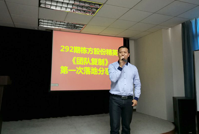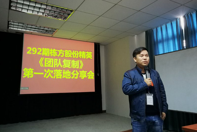 2017年11月23日,棟方股份精英《團隊復(fù)制》第一次落地分享會在公司員工培訓(xùn)室舉行,與會人員除公司邱副總經(jīng)理、黃副總經(jīng)理、人事行政中心胡總監(jiān)及各精英團隊負責人之外,還有幸邀請到聚成金牌講師李經(jīng)理一行蒞臨指導(dǎo)。