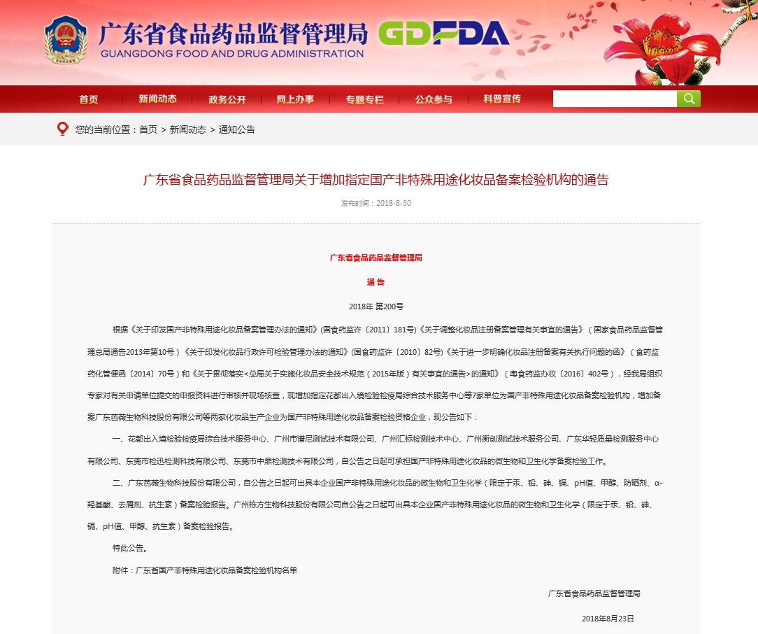 8月23日,廣東省食品藥品監(jiān)督管理局組織專家對(duì)有關(guān)申請(qǐng)單位提交的申報(bào)資料進(jìn)行審核并現(xiàn)場(chǎng)核查,增加備案廣州棟方生物科技股份有限公司為國(guó)產(chǎn)非特殊用途化妝品備案檢驗(yàn)資格企業(yè),廣州棟方生物科技股份有限公司自公告之日起可出具本企業(yè)國(guó)產(chǎn)非特殊用途化妝品的微生物和衛(wèi)生化學(xué)(限定于汞、鉛、砷、鎘、pH值、甲醇、抗生素)備案檢驗(yàn)報(bào)告。詳細(xì)內(nèi)容請(qǐng)見(jiàn)《廣東省食品藥品監(jiān)督管理局通告》(2018年第200號(hào))